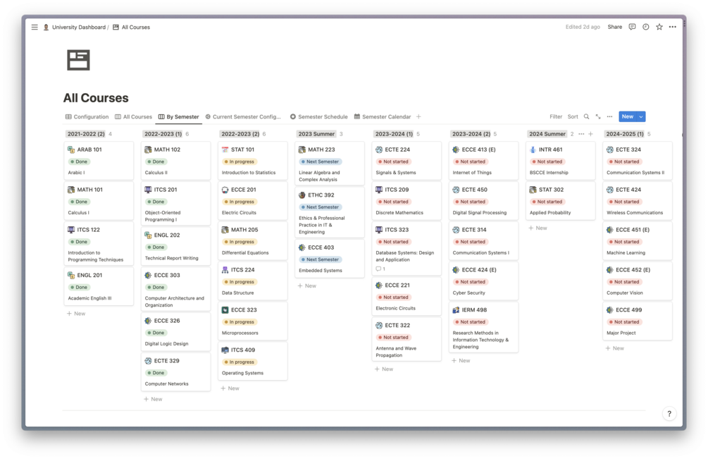 With this notion template, university students can keep all their academic responsibilities organized in one place. You will get access to a dashboard that includes sections for assignment tracking, note-taking, active recall questions, course material storage, and a calendar for university events. This template makes it easy for students to stay on top of their studies, reduce stress, and optimize their academic experience.